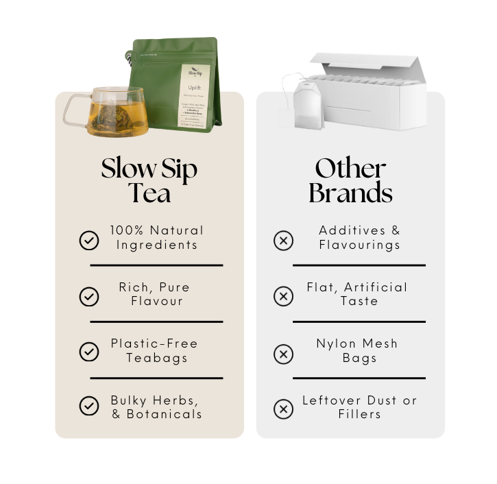 At Slow Sip, everything we create begins with intention. Our blends aren’t rushed, diluted, or mass-produced, they’re crafted for ritual and wellness through a set of guiding principles that shape every step, from sourcing to the final pour.